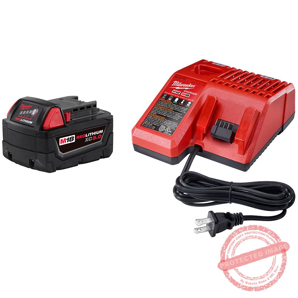 Cargador 220Vac (incluyecable y enchufe) y batería M18 REDLITHIUM HIGH OUTPUT XC 5.0Ah que trabaja en a una T° -18°…40°C, posee sistema de protección contra sobrecarga e incorpora 5 estados LED de carga de la batería; además, indicador parpadeante (batería <= 10%). Alta resistencia a caídas y trabajos con vibración. Uso con todos los equipos de la serie M18 (herramientas y luminarias)