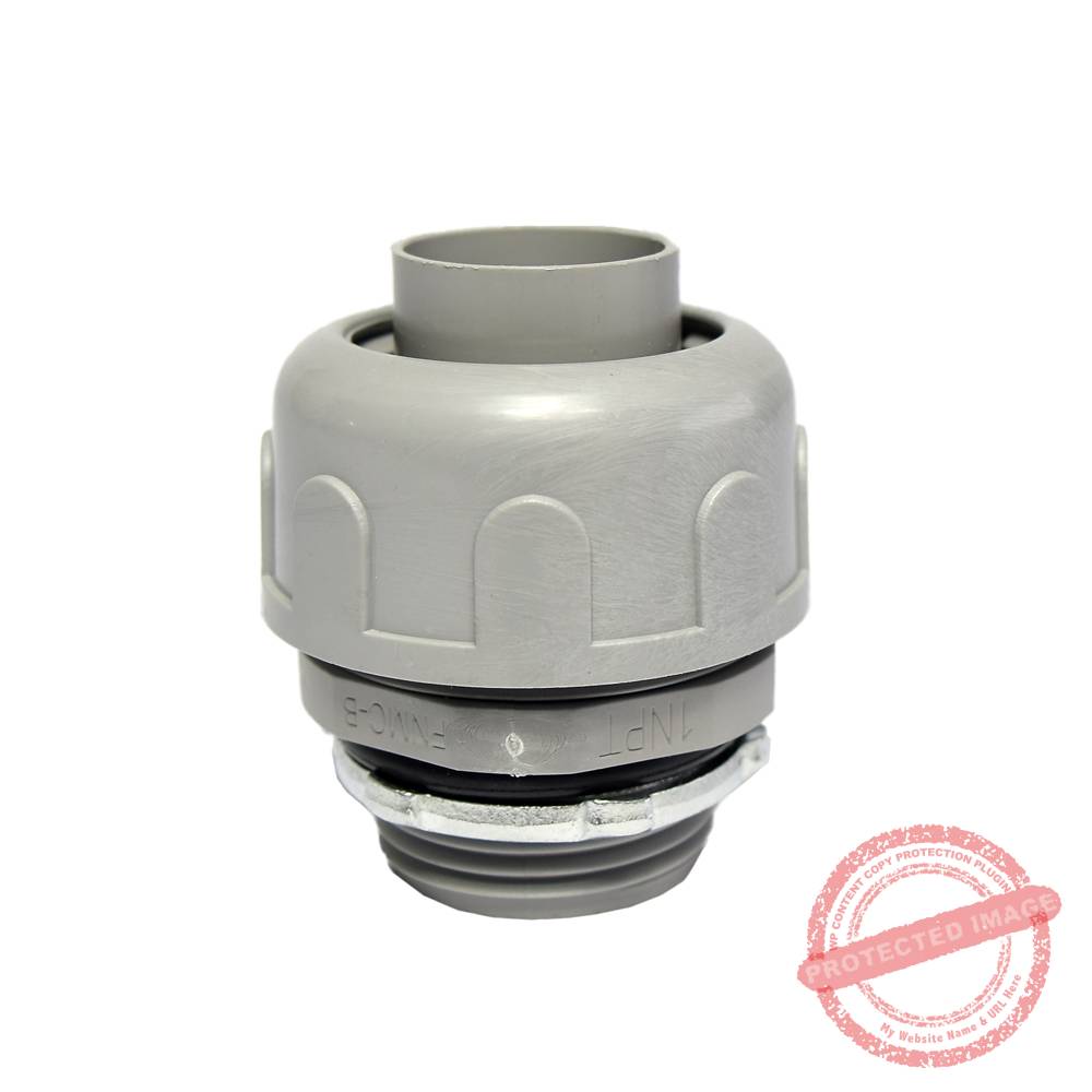 Conector curvo hermético fabricado en PVC. Se utiliza para realizar conexiones de los tubos flexibles no metálicos Liquid Tight en cajas o gabinetes de tal forma que impidan el paso de aceites o líquidos.