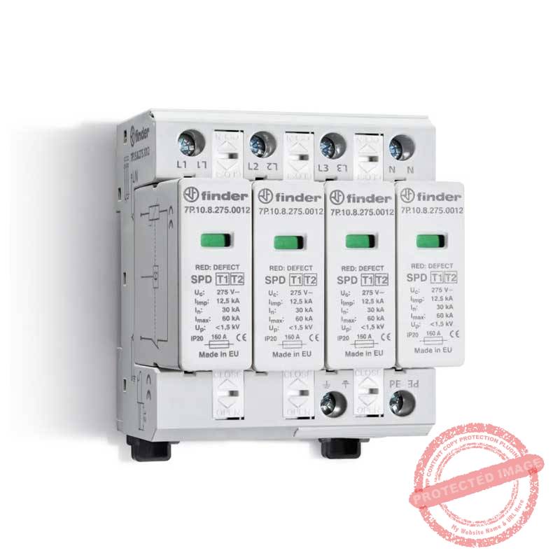 Descargador de sobretensiones trifásico (3P+N) Tipo 1+2, Imax. de ruptura 60kA, 275VAC, protección del neutro con varistor, con contactos auxiliares.
