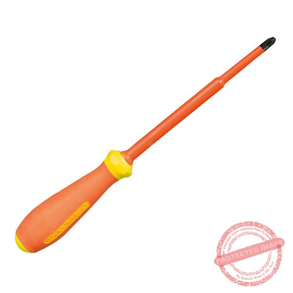 Destornillador estrella Phillips, longitud 125mm, diametro 6mm, material de acero al cromo vanadio molibdeno. Diseñada para trabajos bajo tensión hasta 1000VCA/1500VCC según IEC 60900. El aislamiento ofrece máxima seguridad y adherencia ante posibles imprevistos. Peso: 110g.