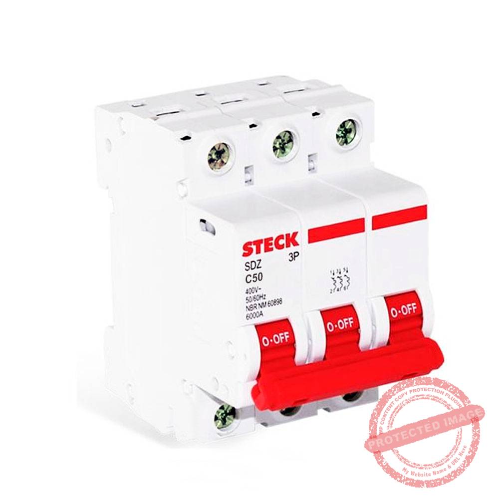 Interruptor termomagnético 3x50A con poder de ruptura de 10kA a 230 VAC según norma IEC 60898 y 6kA a 400VAC, 230/400V curva C DIN.