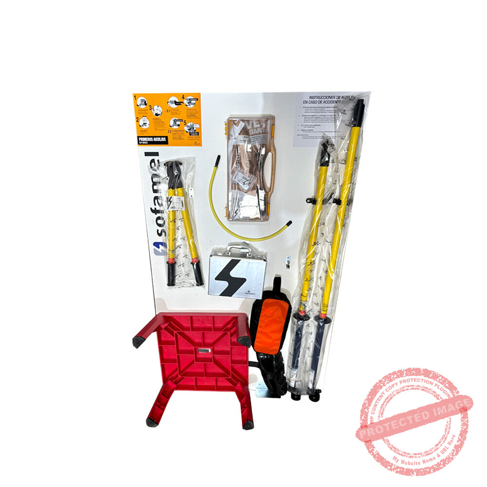 Kit de salvamento mural 36kV que permiten una intervención en víctimas en caso de riesgo eléctrico. Está compuesta por una banqueta aislante de 45kV, detector de tensión de contacto (5-36kV), guantes aislantes clase 4 talla 09 en cofre plástico, zapatos aislantes, pértigas telescopicas de 45kV, cizalla corta cables aisladas.