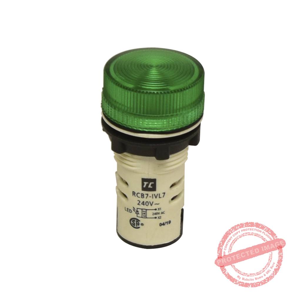 Piloto verde con LED 240VAC plástico, aplicaciones en tableros.