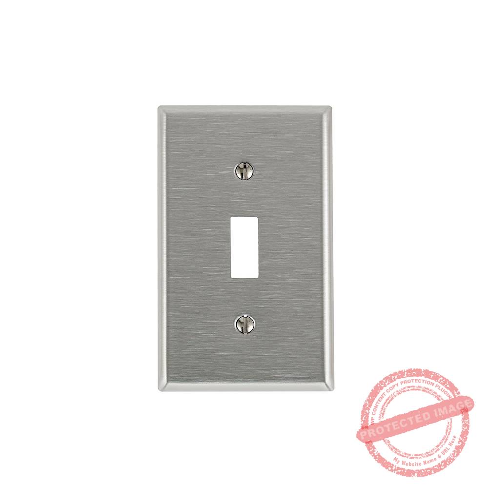 Placa para 1 interruptor tipo palanca. Material: acero inoxidable con acabado satinado. Incluye 2 pernos para su fijación. Certificación: UL.