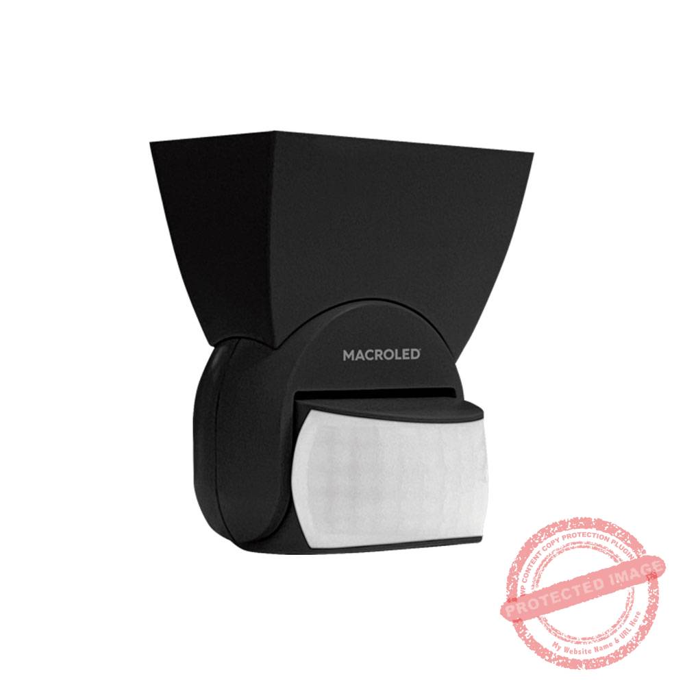 Sensor PIR 220-240V, adosable uso exterior, distancia de detección máximo 12mts, ángulo de detección180°, altura de montaje máx. 4mts, comandos ajustables de tiempo 10-900s y lux 3-2000, proteción IP65, protección UV, color negro.
