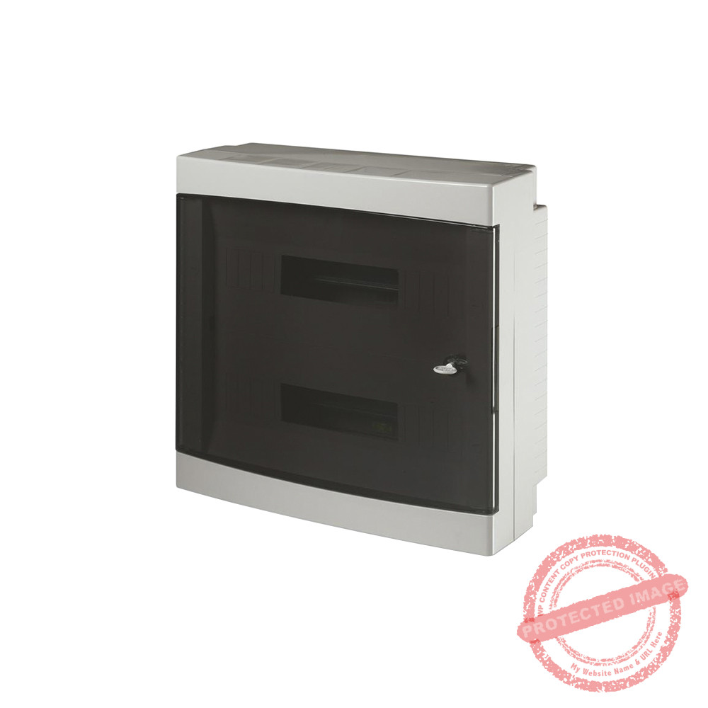 Tablero para adosar. Material: termoplástico libre de halógenos y autoextinguible. Grado de protección: IP40. Resistente al calor y fuego hasta 650°C. Incluye riel DIN para 36 polos (2 pisos) con puerta, nivel de burbuja, etiqueta autoadhesiva para la identificación de los circuitos. Dimensiones: 400x434x140mm.